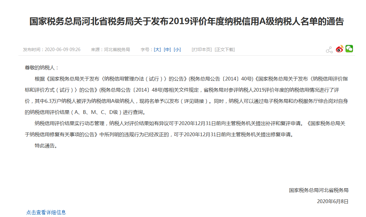 国家税务总局河北省税务局关于发布2019年评价年度纳税信用A级纳税人名单通告